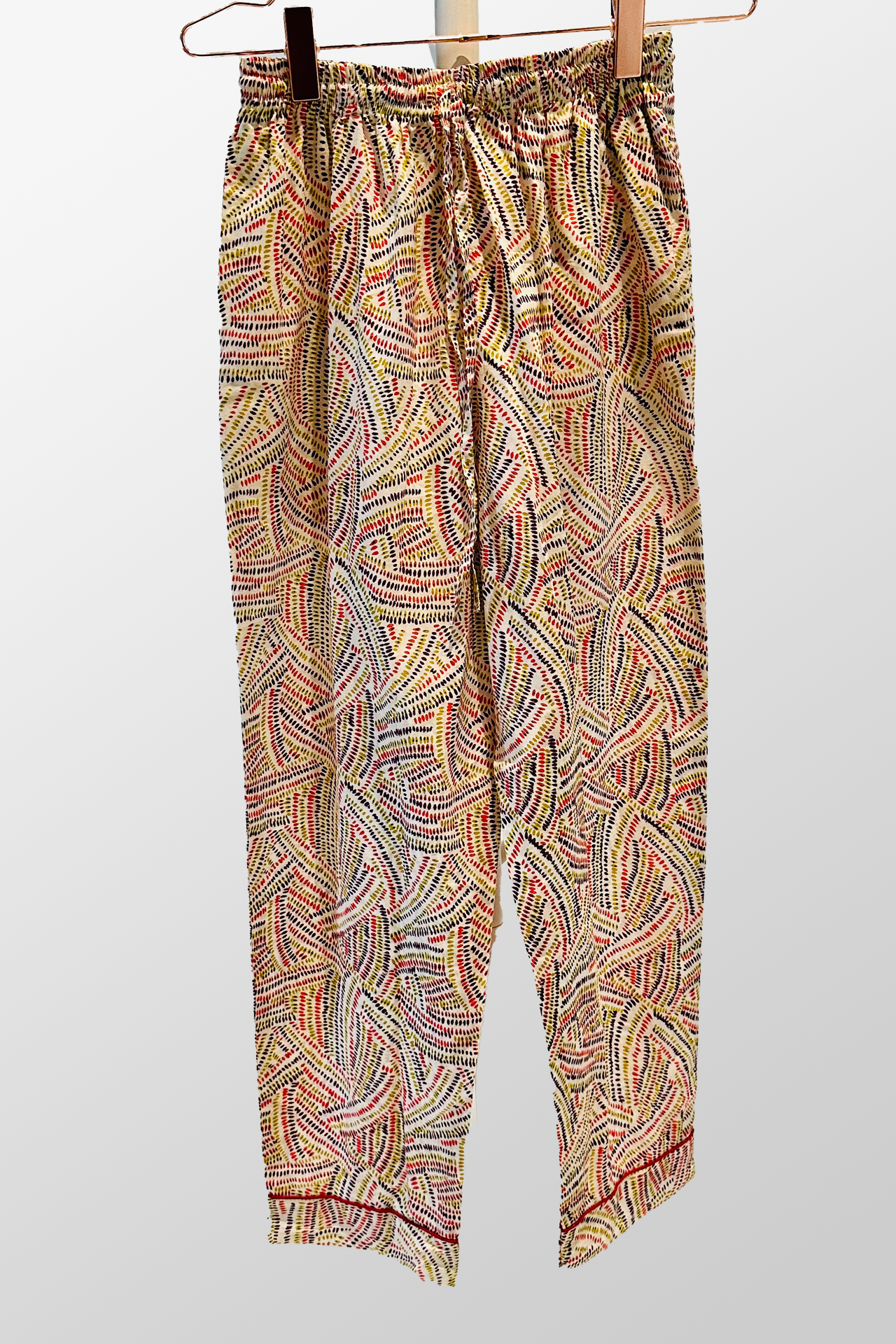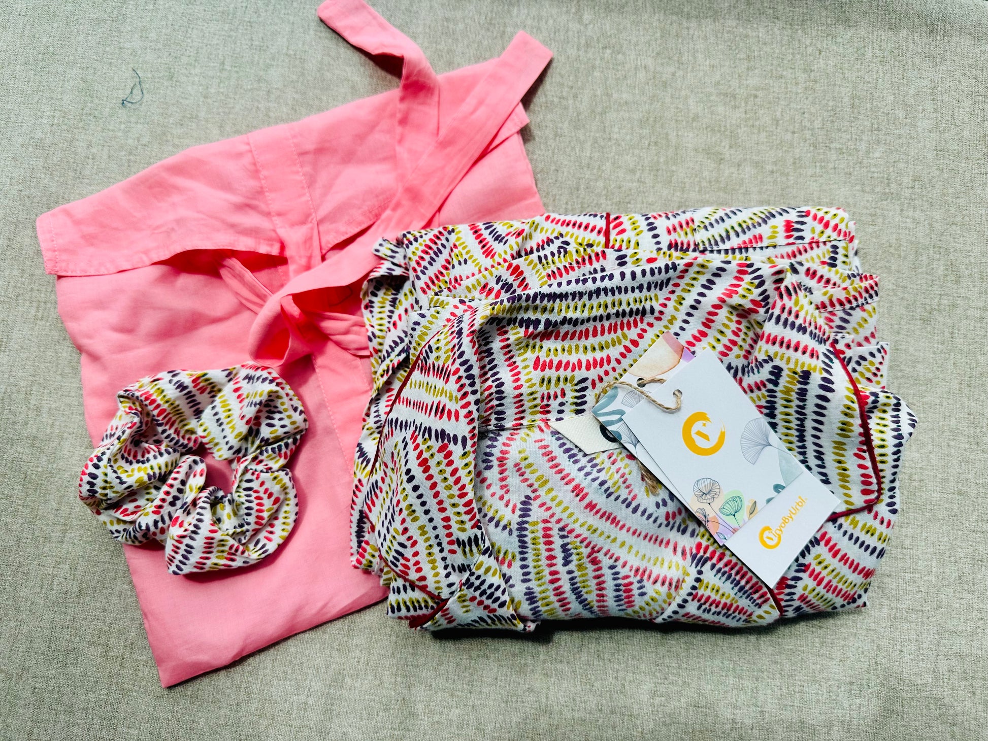 This is a multi-colored set that is fun and bright set in light colors. The fabric is soft, high-quality 100% cotton, each piece is block printed with love — bringing heritage prints and vibrant hues right into your everyday wear.