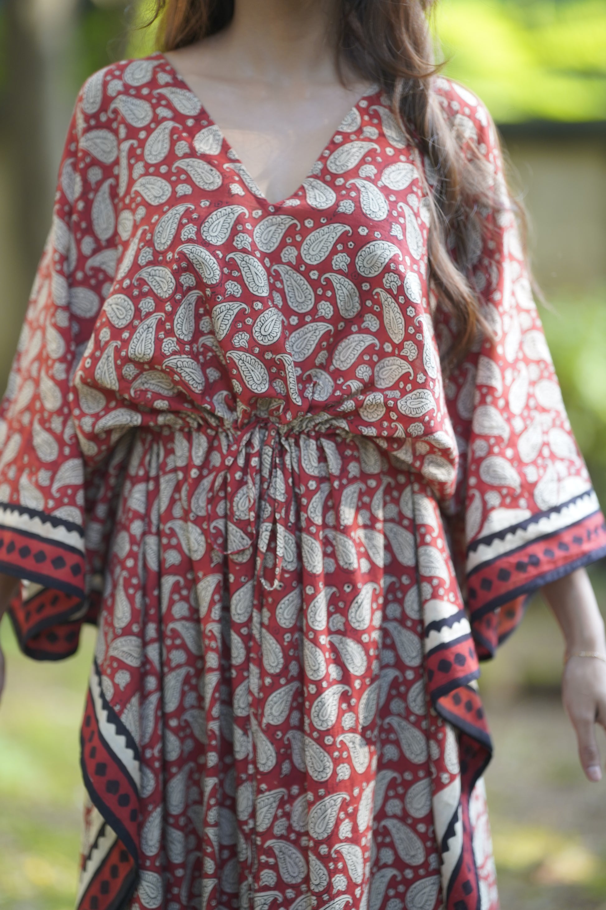 Make a bold statement with our hand block printed kaftan in striking red and black tones. Crafted from 100% cotton, this piece is both dramatic and versatile, perfect for an effortlessly chic look from day to night. Its rich colors and comfortable fit make it an ideal choice for any occasion, whether you’re turning heads during the day or adding elegance to an evening event.