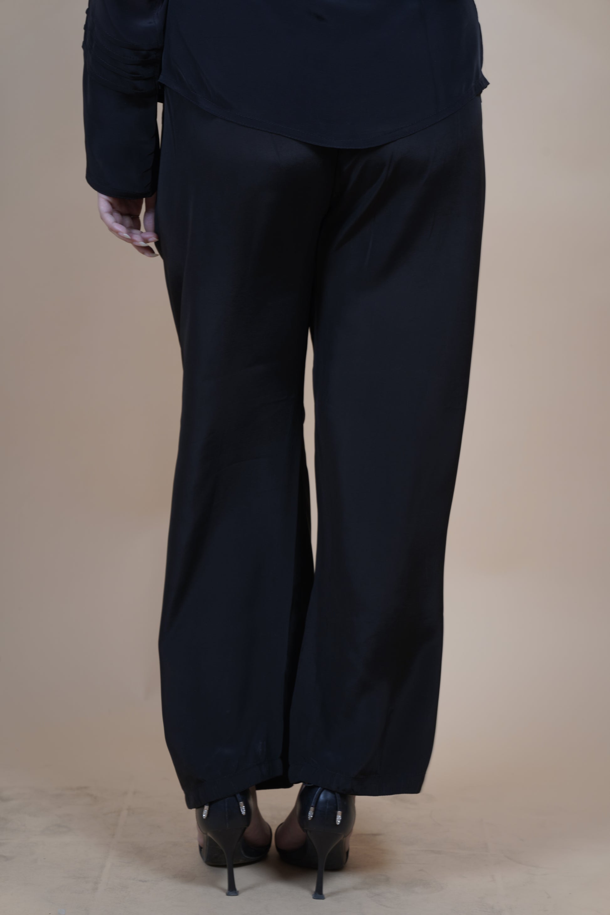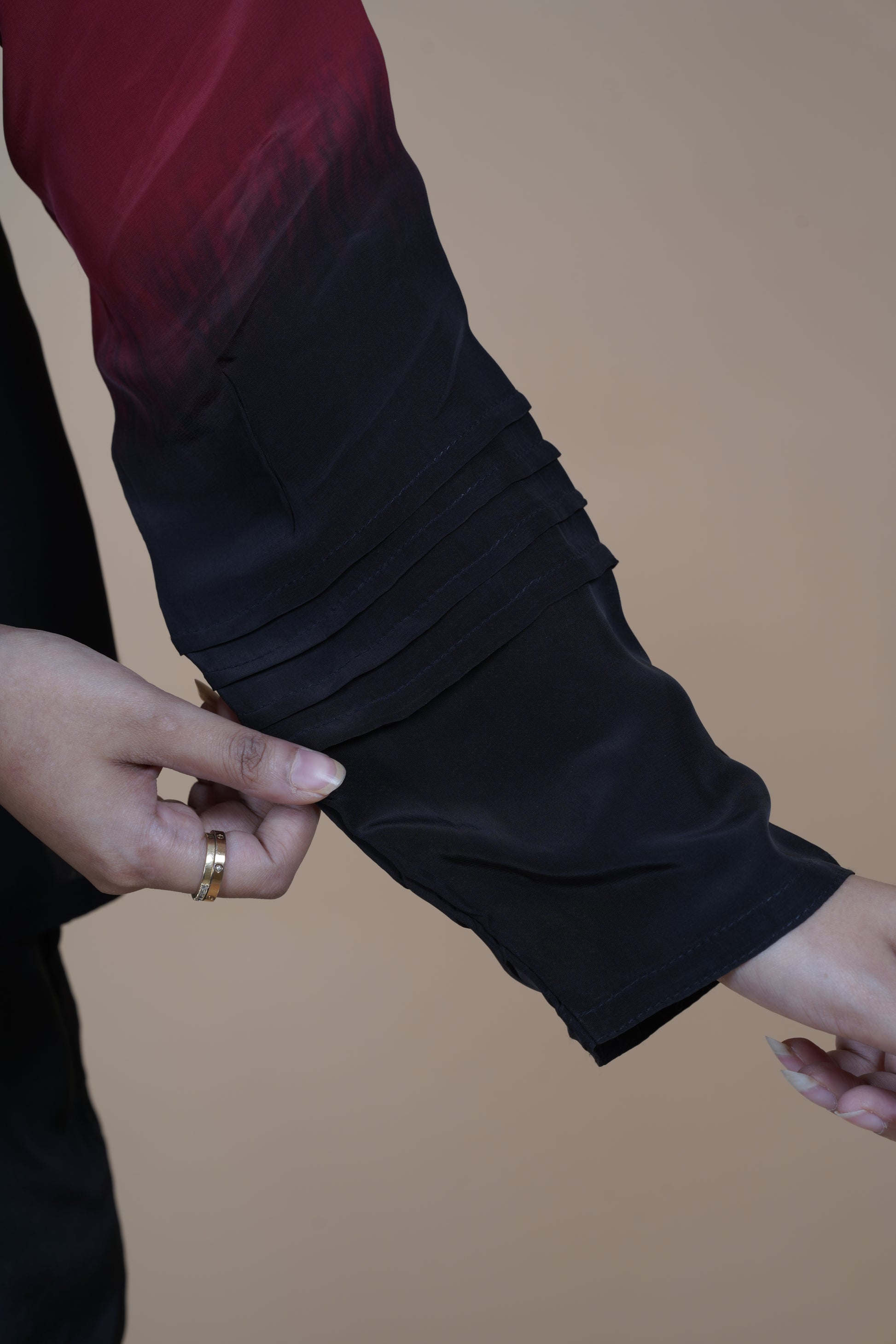 A complete look in one go. This co-ord set has a light and breezy crepe fabric for a comfortable and all-weather day. The set stands out with its ombre effects transcending from Maroon to black for a nice sundowner event or evening out.