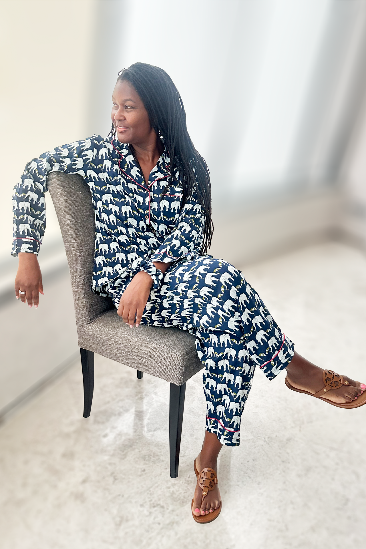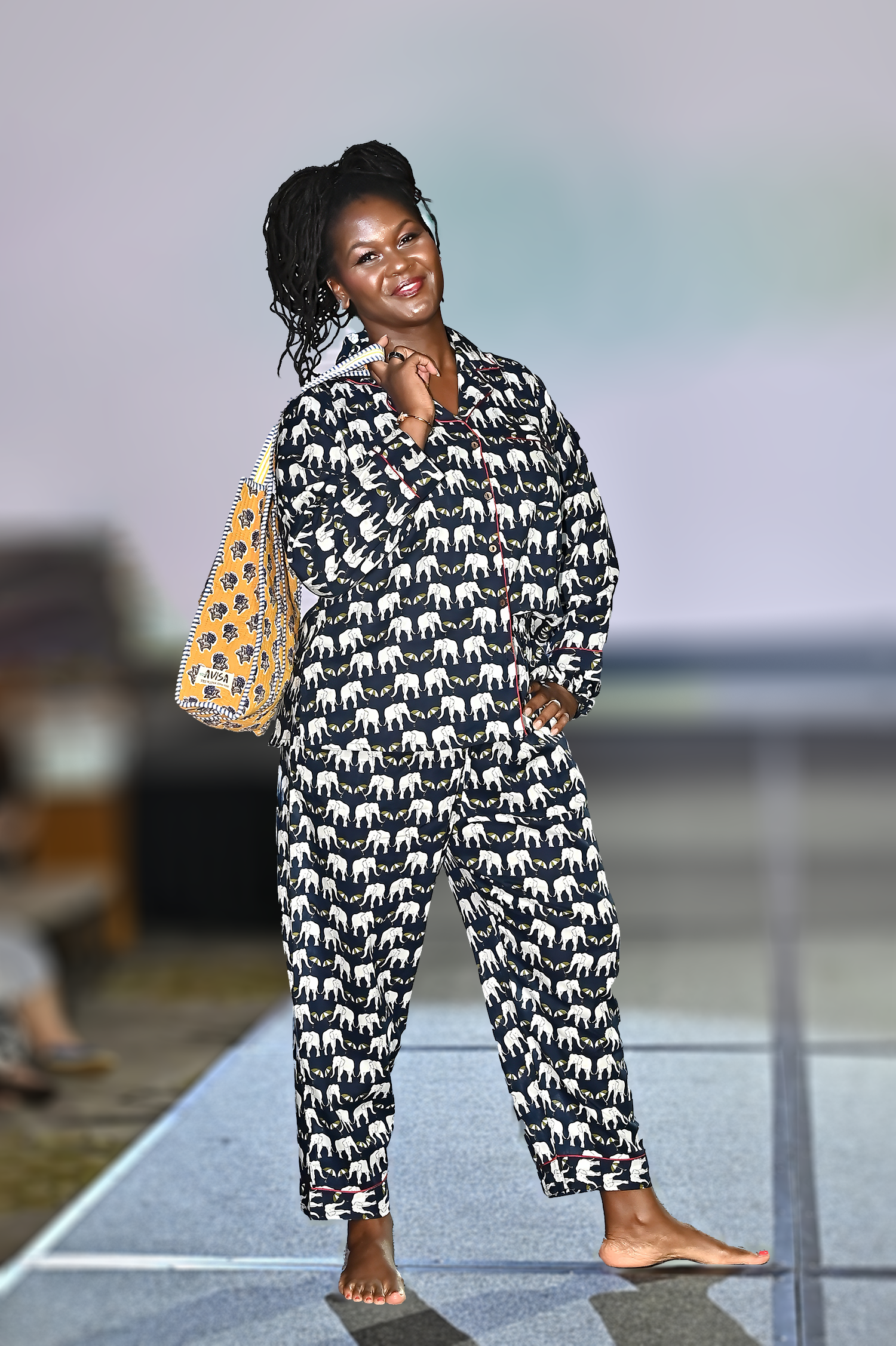 The set comes with the pajama top. pajama bottoms with side pockets, a matching hair scrunchy and a fabric pouch bag to carry them all in. So it's a 4-pc set.