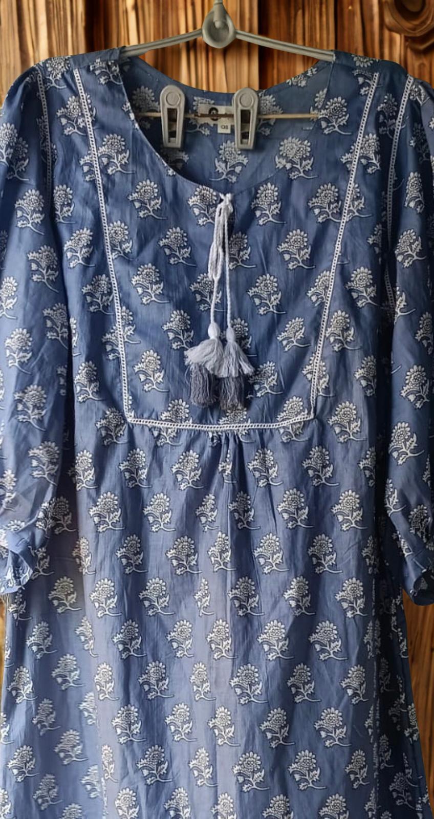 This free-size grey dress is made from 100% cotton and features a detachable cord belt, elastic sleeve cuffs, and a 49” length.