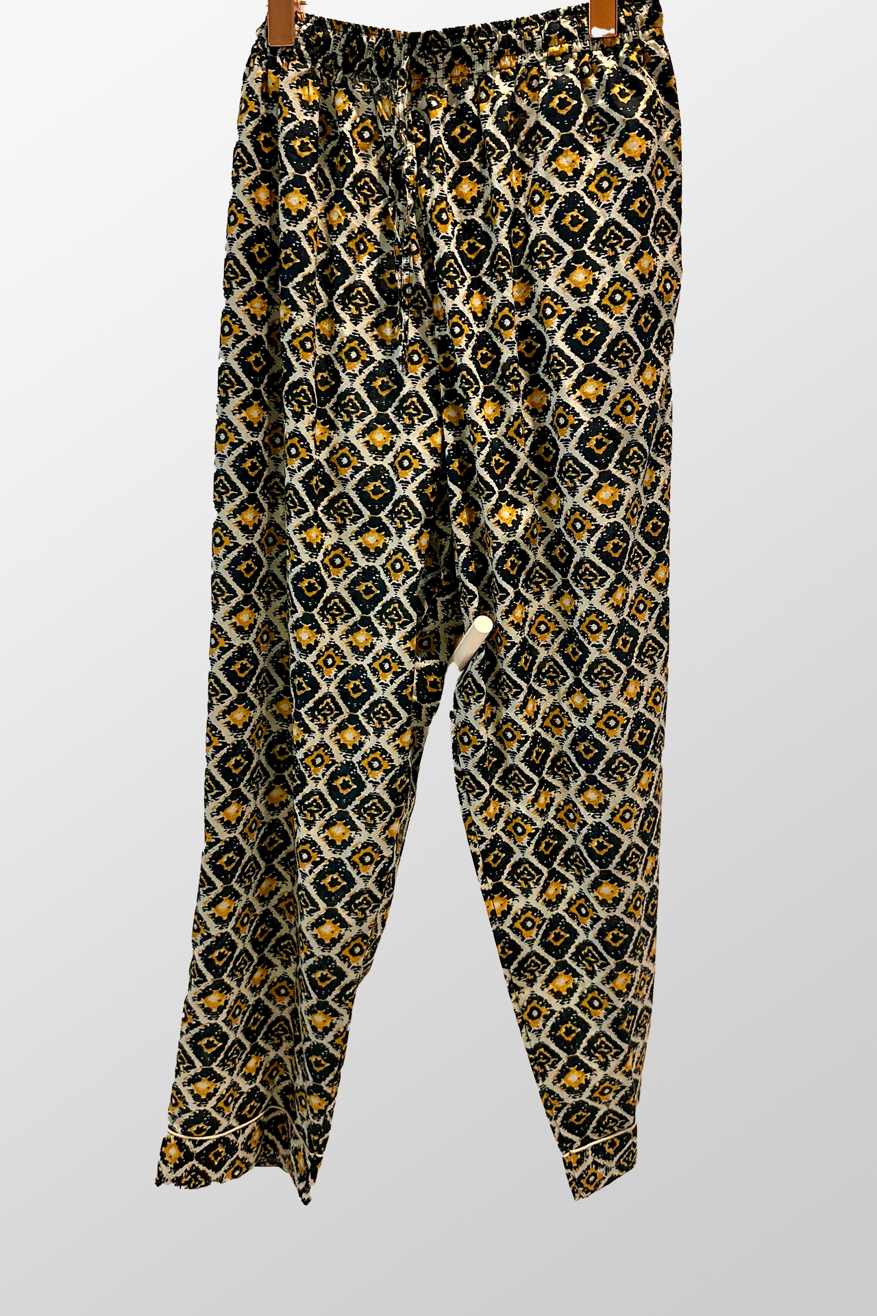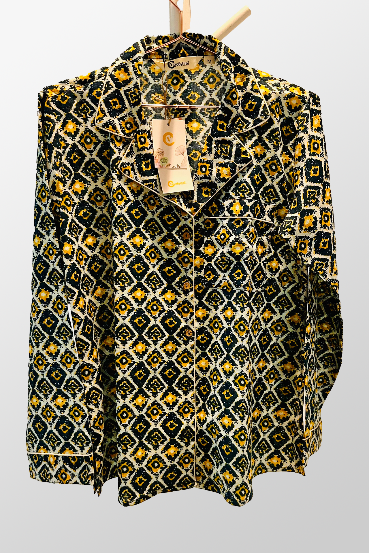 This set is in mustard and navy print. The fabric is soft, high-quality 100% cotton, each piece is block printed with love — bringing heritage prints and vibrant hues right into your everyday wear.